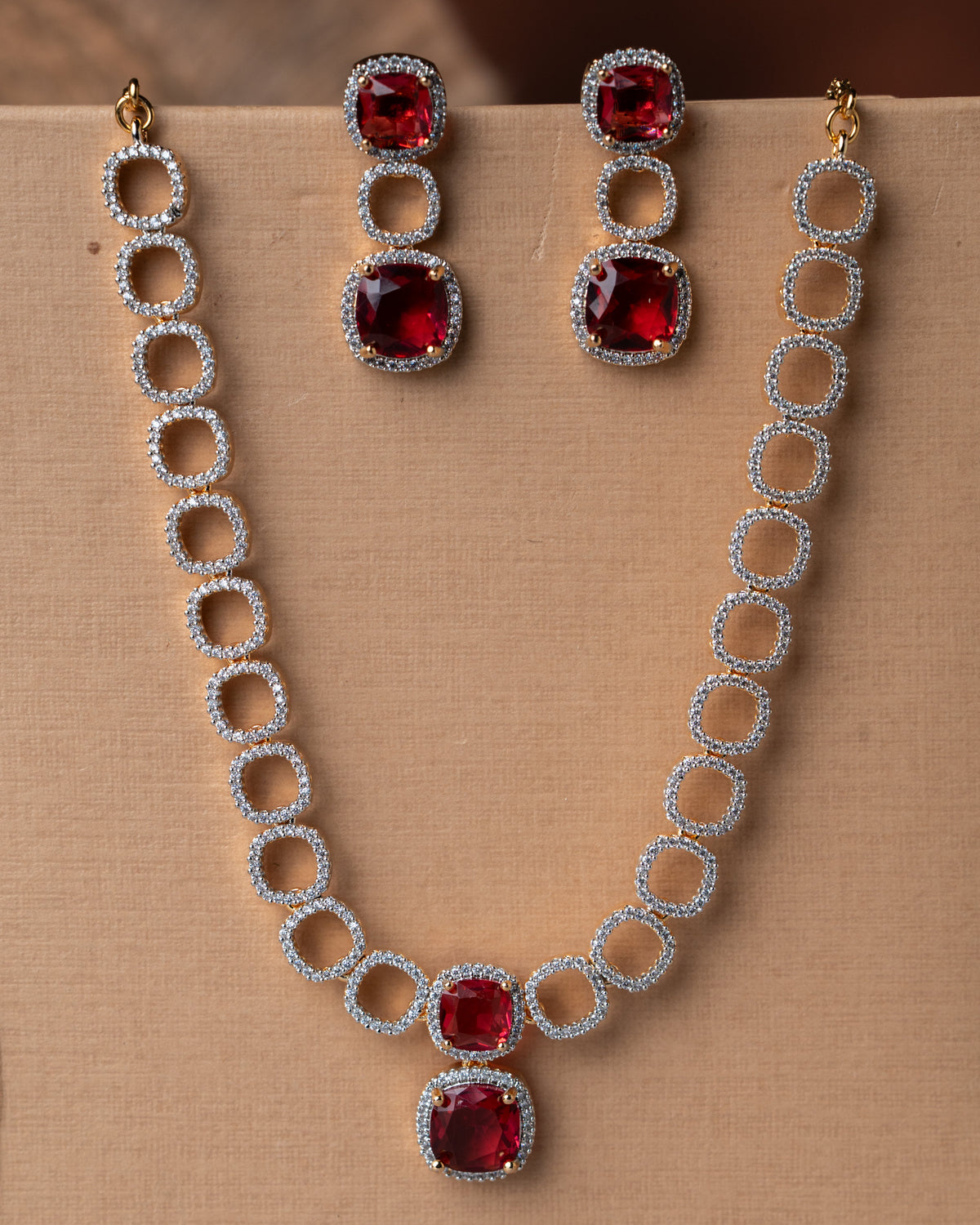 This captivating Gold-Toned AD and Ruby Necklace Set features a modern, linked design. The necklace is composed of open, circular frames meticulously paved with shimmering American Diamonds (AD), creating a delicate chain. The centerpiece showcases two prominent, cushion-cut ruby-red stones framed by AD accents. Matching drop earrings feature similar vivid red stones. This striking set offers a traditional elegance with a bold splash of color, perfect for special occasions.