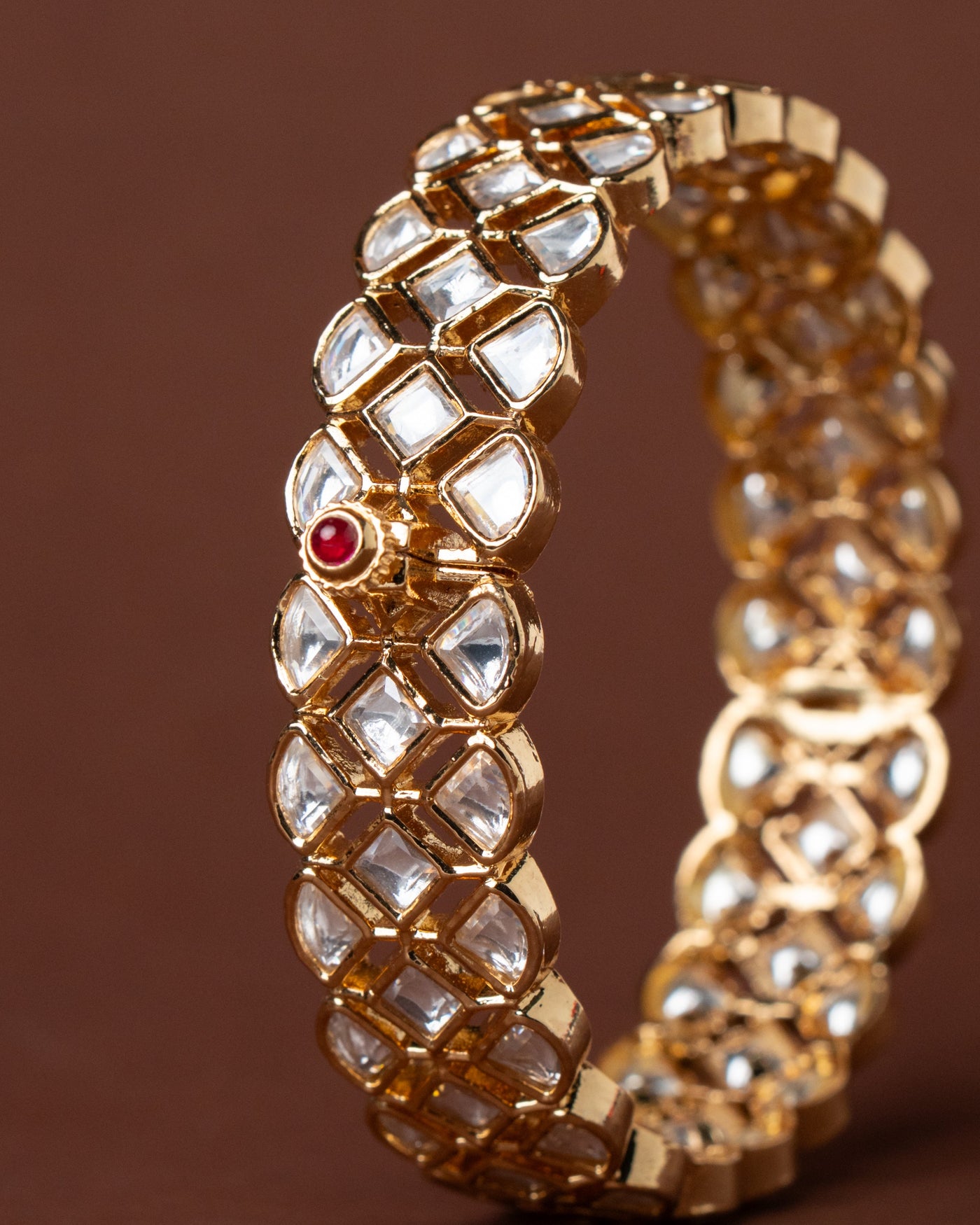Add timeless charm to your collection with the Kundan Elegance Bangle from Kanha Art Jewellery. Designed with classic mirror-finish kundan stones set in a golden frame and accented with a single ruby detail, this bangle beautifully blends tradition with sophistication. Perfect for festive occasions, weddings, or to elevate any ethnic look with grace.